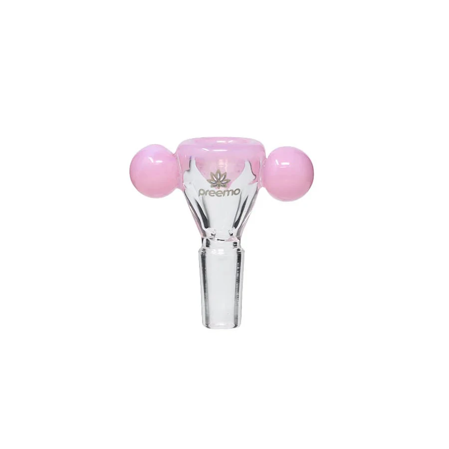 This bowl features two baubles for easy handling, keeping your hands away from the heat. The outer glass is all clear, including the joint, allowing the inside bowl color to show through. It comes in beautiful colors that easily match your Preemo bongs.