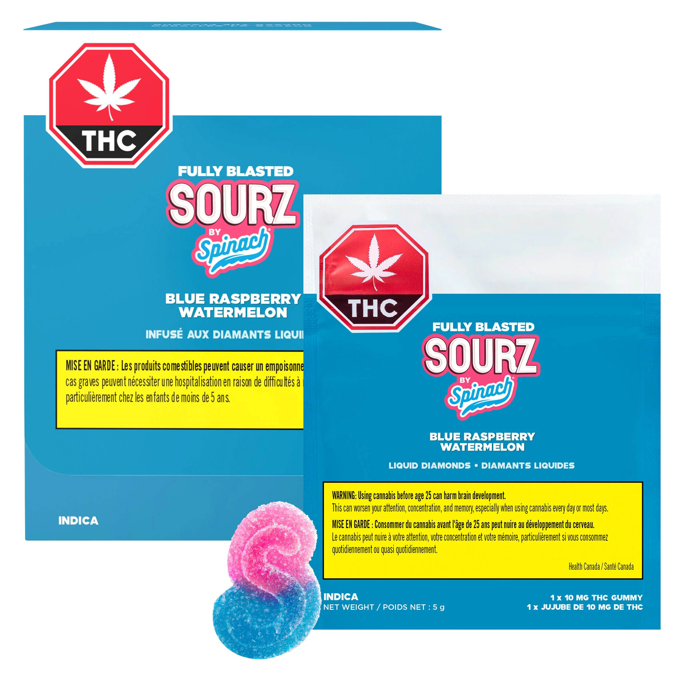 Prepare for blast off! SOURZ by Spinach® Fully Blasted Blue Raspberry Watermelon gummies are packed with 10mg THC per piece. With out-of-this-world flavours like electric blue raspberry and fresh watermelon, send your taste buds soaring! These dual-flavoured gummies are over-the-top with natural flavours and blasted with sour crystals. Enjoy 10 gummies with 10mg THC per gummy and 100mg THC total per pack.