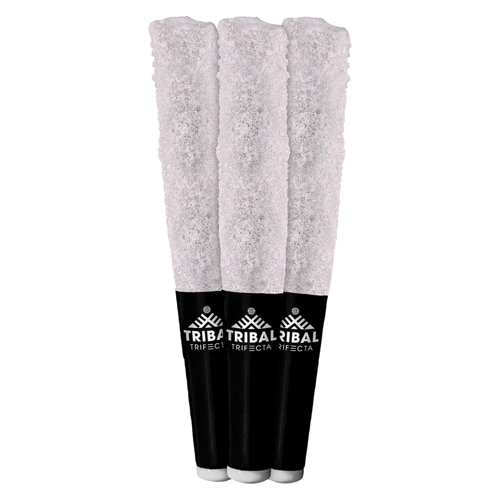 Tribal Trifecta. No fake terpenes and no distillate. Tribal Trifecta Galatic Rntz infused pre-rolls start with Galatic Rntz flower that is triple infused with Galatic Rntz live resin, terpene sauce and THC-A diamonds. Rolled and finished with a ceramic tip. Live resin + terpene sauce + THC-A diamonds = the Tribal Trifecta.